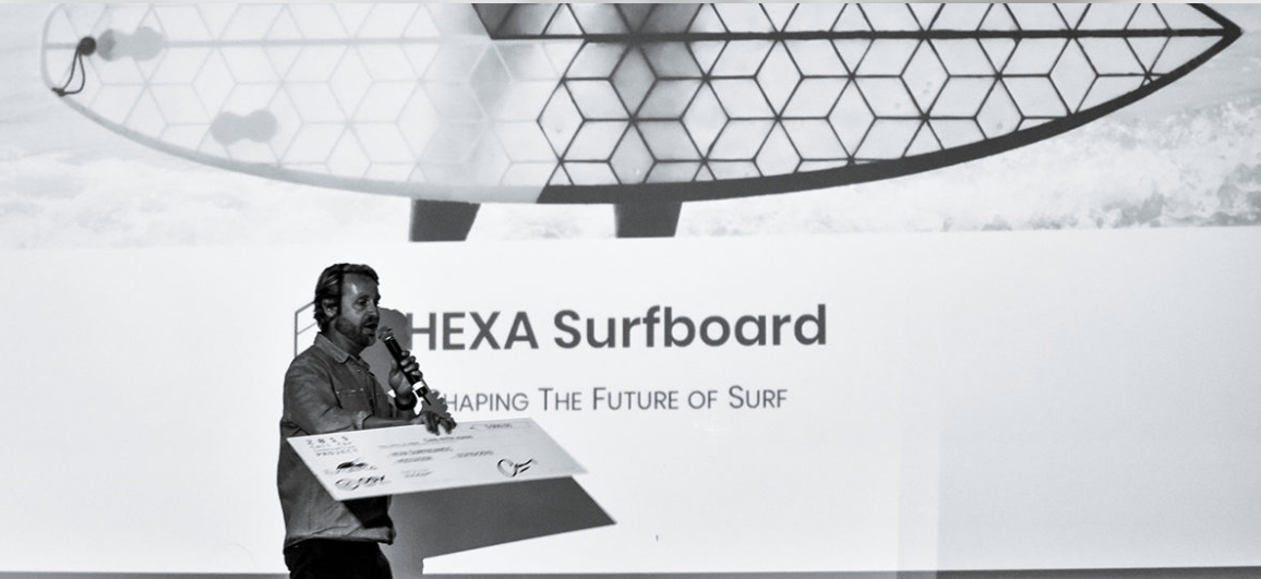 Thanks to Léo's naval architecture skills, they produced their first prototype 3D-printed board. Its hexagonal structure enables to control flexibility. 3D printing offers a wide choice of bio-based materials.